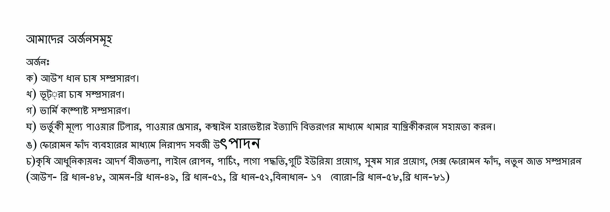 চ)কৃষি আধুনিকায়নঃ আদর্শ বীজতলা, লাইনে রোপন, পার্চিং, লগো পদ্ধতি,গুটি ইউরিয়া প্রয়োগ, সুষম সার প্রয়োগ, সেক্স ফেরোমন ফাঁদ, নতুন জাত সম্প্রসারন (আউশ- ব্রি ধান-৪৮, আমন-ব্রি ধান-৪৯, ব্রি ধান-৫১, ব্রি ধান-৫২,বিনাধান- ১৭ বোরো-ব্রি ধান-৫৮,ব্রি ধান-৮১)